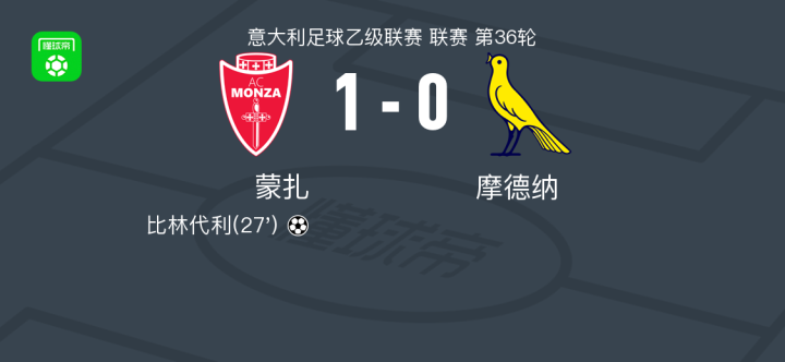 蒙扎1-0摩德纳,比林代利制胜球 足球资讯 发布时间: 2026年4月25日 阅读时间: 少于1 分钟 FacebookXPinterestWhatsApp 蒙扎1-0摩德纳,比林代利制胜球 北京时间4月25日意大利足球乙级联赛 联赛 第36轮,蒙扎主场对阵摩德纳。蒙扎比林代利破门。最终比分蒙扎 1–0 摩德纳。 点击查看本场比赛详细数据>> 点击查看意乙完整积分榜>> 精彩瞬间 第27分钟,蒙扎球员比林代利打入一球。 球队阵容 技术统计 FacebookXPinterestWhatsApp 1823100https://1823100.com 红单推荐 023 英超 阿森纳vs纽卡斯尔 红单推荐 2026年4月25日 016 英超 狼队vs热刺 红单推荐 2026年4月25日 013 英超 桑德兰vs诺丁汉 红单推荐 2026年4月24日 014 西甲 贝蒂斯vs皇马 红单推荐 2026年4月24日 005 西甲 巴列卡诺vs西班牙人 红单推荐 2026年4月23日 热门资讯 约基奇第198次三双!掘金大胜灰熊豪取10连胜 穆雷26+7+5 篮球资讯 2026年4月9日 005 西甲 巴列卡诺vs西班牙人 红单推荐 2026年4月23日 002 欧协联 巴列卡诺vs雅典AEK 红单推荐 2026年4月9日 023 英超 阿森纳vs纽卡斯尔 红单推荐 2026年4月25日 003 西甲 莱万特vs塞维利亚 红单推荐 2026年4月23日