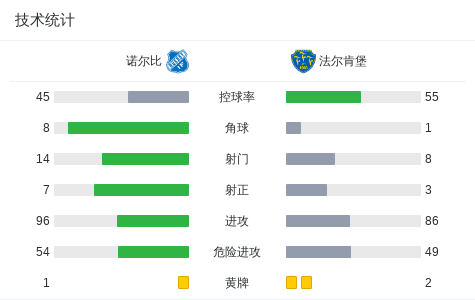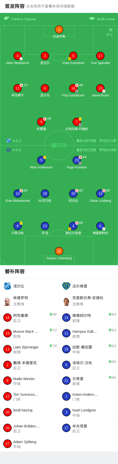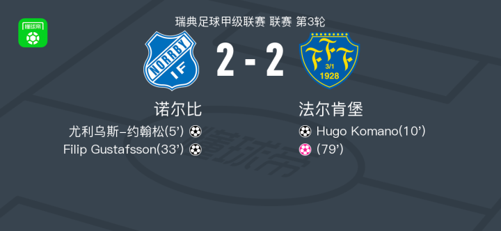 北京时间4月19日瑞典足球甲级联赛 联赛 第3轮,诺尔比主场对阵法尔肯堡。诺尔比尤利乌斯-约翰松破门,Filip Gustafsson破门。法尔肯堡Hugo Komano破门。最终比分诺尔比 22 法尔肯堡。