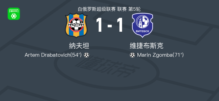 北京时间4月25日白俄罗斯超级联赛 联赛 第5轮,纳夫坦主场对阵维捷布斯克。纳夫坦Artem Drabatovich破门。维捷布斯克Marin Zgomba破门。最终比分纳夫坦 1–1 维捷布斯克。