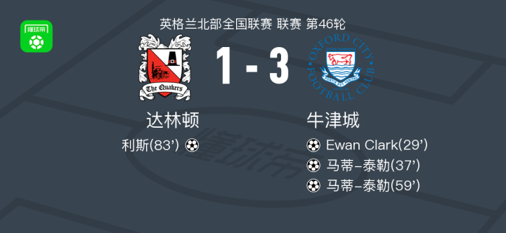北京时间4月25日英格兰北部全国联赛 联赛 第46轮,达林顿主场对阵牛津城。达林顿利斯破门。牛津城Ewan Clark破门,马蒂-泰勒梅开二度。最终比分达林顿 13 牛津城。