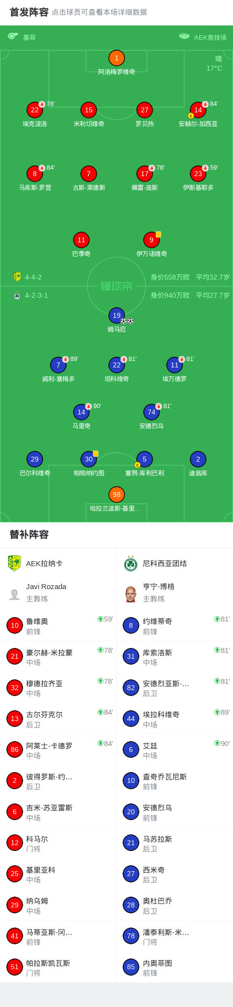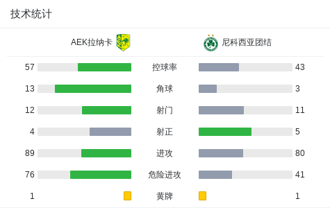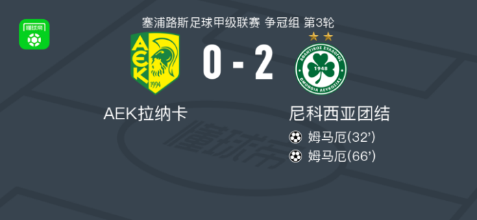 尼科西亚团结2-0AEK拉纳卡,姆马厄独中两元 足球资讯 发布时间: 2026年4月15日 阅读时间: 少于1 分钟 FacebookXPinterestWhatsApp 尼科西亚团结2-0AEK拉纳卡,姆马厄独中两元 北京时间4月15日塞浦路斯足球甲级联赛 争冠组 第3轮,AEK拉纳卡主场对阵尼科西亚团结。尼科西亚团结姆马厄梅开二度。最终比分AEK拉纳卡 0–2 尼科西亚团结。 点击查看本场比赛详细数据>> 点击查看塞浦甲完整积分榜>> 精彩瞬间 第32分钟,尼科西亚团结球员姆马厄打入一球。 第66分钟,尼科西亚团结球员姆马厄打入一球。 球队阵容 技术统计 FacebookXPinterestWhatsApp 1823100https://1823100.com 红单推荐 005 西甲 巴列卡诺vs西班牙人 红单推荐 2026年4月23日 003 西甲 莱万特vs塞维利亚 红单推荐 2026年4月23日 015 西甲 巴萨vs塞尔塔 红单推荐 2026年4月22日 012 英超 伯恩茅斯vs利兹联 红单推荐 2026年4月22日 007 意杯 国际米兰vs科莫 红单推荐 2026年4月21日 热门资讯 萨拉戈萨U19 0-0乌德山U19,双方握手言和 足球资讯 2026年4月12日 萨拉赫安菲尔德英超进108球,联赛历史单座球场进球仅次于亨利 足球资讯 2026年4月12日 萨拉赫英超打入157粒非点球进球,追平阿圭罗列历史第五 足球资讯 2026年4月12日 郑大世:森保一执教风格很有人情味;日本队还得日本人执教 足球资讯 2026年4月23日 萨拉赫英超参与250粒非点球进球,成历史第五人 足球资讯 2026年4月12日