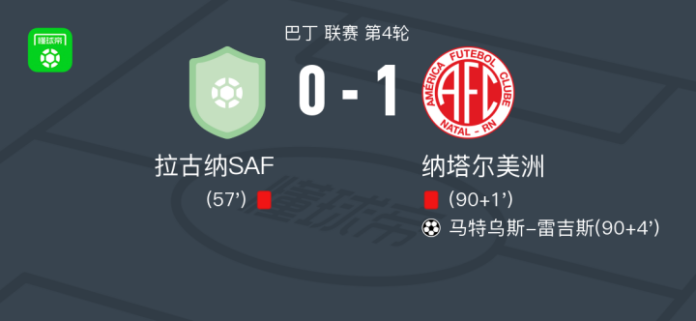下半场补时第4分钟,纳塔尔美洲球员马特乌斯-雷吉斯打入一球。