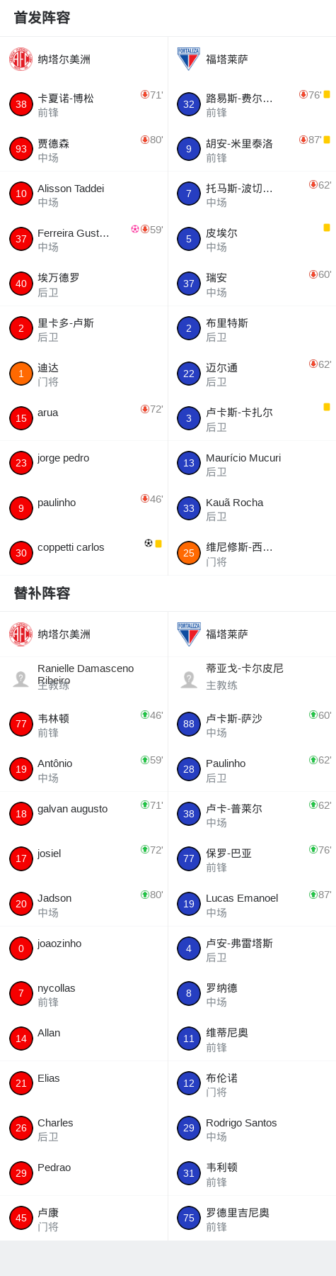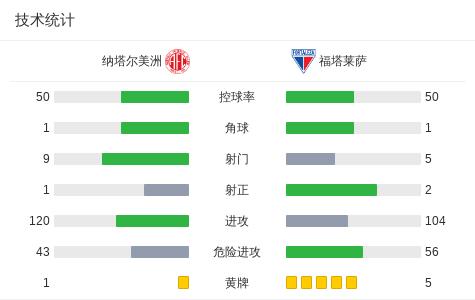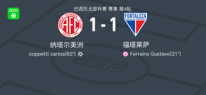 北京时间4月17日巴西东北部杯赛 赛事 第4轮,纳塔尔美洲主场对阵福塔莱萨。纳塔尔美洲coppetti carlos破门,Ferreira Gustavo自摆乌龙。最终比分纳塔尔美洲 1–1 福塔莱萨。