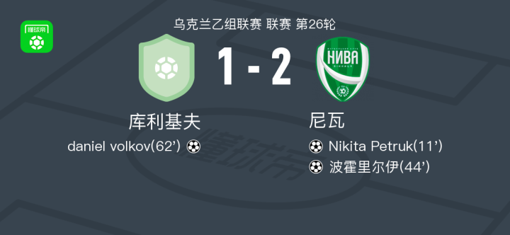 北京时间4月12日乌克兰乙组联赛 联赛 第26轮,库利基夫主场对阵尼瓦。库利基夫daniel volkov破门。尼瓦Nikita Petruk破门,波霍里尔伊破门。最终比分库利基夫 12 尼瓦。