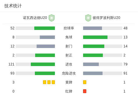 诺瓦西达德U20 0-0彼得罗波利斯U20,势均力敌 足球资讯 发布时间: 2026年4月23日 阅读时间: 少于1 分钟 FacebookXPinterestWhatsApp 诺瓦西达德U20 0-0彼得罗波利斯U20,势均力敌 北京时间4月23日巴西里约州乙级联赛,诺瓦西达德U20主场对阵彼得罗波利斯U20。最终比分诺瓦西达德U20 0–0 彼得罗波利斯U20。 点击查看本场比赛详细数据>> 精彩瞬间 第36分钟,彼得罗波利斯U20球队吃到红牌。 技术统计 FacebookXPinterestWhatsApp 1823100https://1823100.com 红单推荐 015 西甲 巴萨vs塞尔塔 红单推荐 2026年4月22日 012 英超 伯恩茅斯vs利兹联 红单推荐 2026年4月22日 007 意杯 国际米兰vs科莫 红单推荐 2026年4月21日 005 西甲 毕尔巴鄂竞技vs奥萨苏纳 红单推荐 2026年4月21日 001 意甲 莱切vs佛罗伦萨 红单推荐 2026年4月20日 热门资讯 萨拉戈萨U19 0-0乌德山U19,双方握手言和 足球资讯 2026年4月12日 007 英冠 伊普斯维奇vs米德尔斯堡 红单推荐 2026年4月19日 克莱普尔1-0巴拉卡斯体育,Aaron Caraballo一锤定音 足球资讯 2026年4月13日 曼撒肯0-0哈马索斯,秋色平分 足球资讯 2026年4月23日 019 英超 曼城vs阿森纳 红单推荐 2026年4月19日