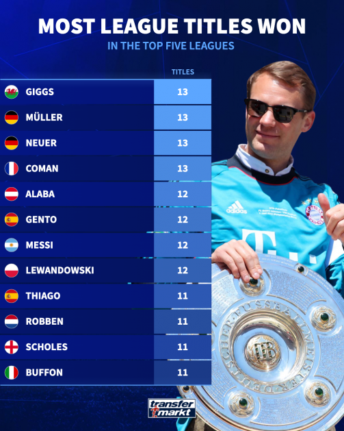 那么,这么多年下来,哪些球员拿到的五大联赛联赛冠军最多呢?德国转会市场统计了历史排名,榜单上出现了一串传奇名字。