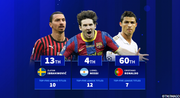 有趣的是,在16位拿到10次及以上五大联赛冠军的球员里,只有布冯和伊布拉希莫维奇(10次)没有拿过欧冠冠军。