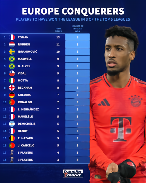穆勒和科曼在拜仁慕尼黑期间,也都拿到了13次五大联赛冠军。而四月底拜仁锁定2025/26赛季德甲冠军后,他们的前队友诺伊尔也加入了13冠俱乐部。诺伊尔和穆勒拿到的全是德甲冠军,而科曼有9次德甲、2次意甲和2次法甲。