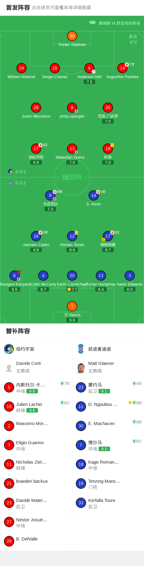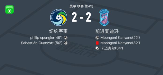 北京时间4月20日美甲 联赛 第4轮,纽约宇宙对阵前进麦迪逊。纽约宇宙philip spengler破门,Sebastián Guenzatti破门。前进麦迪逊Mbongeni Kanyane破门,卡迈克尔破门。最终比分纽约宇宙 2–2 前进麦迪逊。