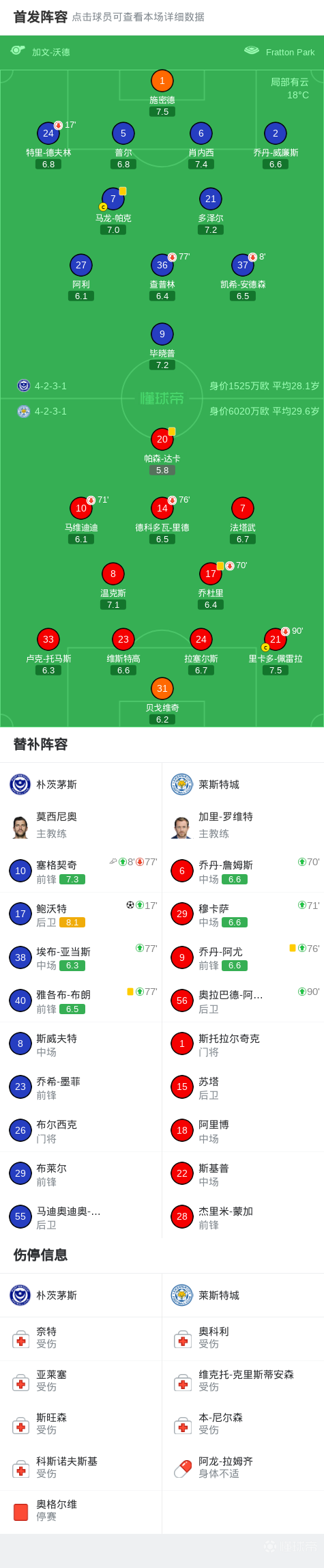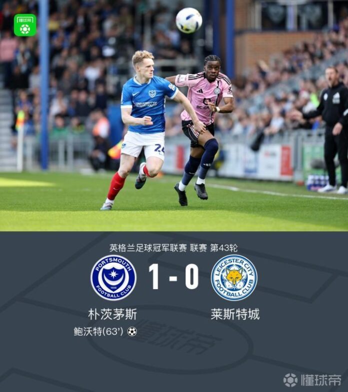 北京时间4月18日英格兰足球冠军联赛第43轮,朴茨茅斯主场对阵莱斯特城。下半场鲍沃特打入制胜球。最终比分朴茨茅斯 1–0 莱斯特城。