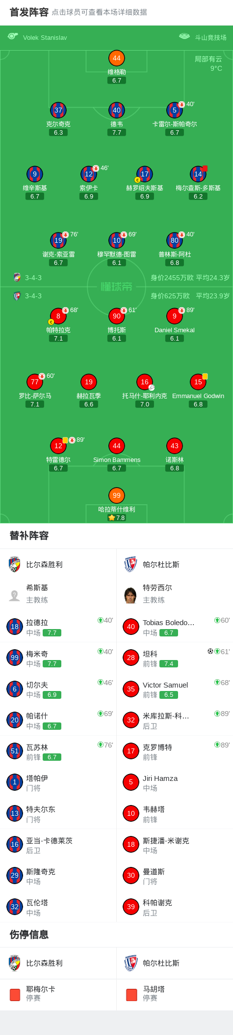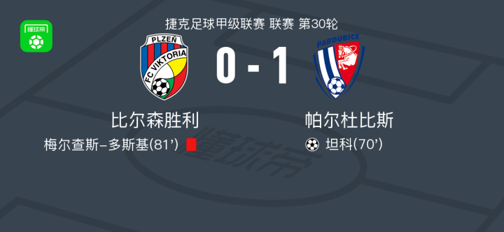 北京时间4月20日捷克足球甲级联赛 联赛 第30轮,比尔森胜利主场对阵帕尔杜比斯。帕尔杜比斯坦科破门。最终比分比尔森胜利 01 帕尔杜比斯。