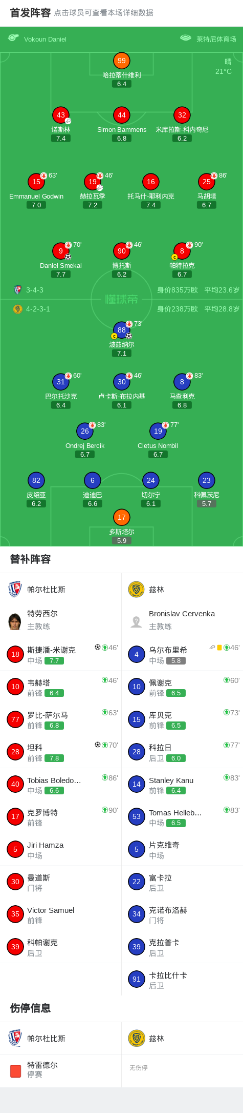 第42分钟,帕尔杜比斯球员赫拉瓦季助攻Daniel Smekal打入一球。