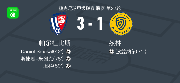 北京时间4月25日捷克足球甲级联赛 联赛 第27轮,帕尔杜比斯主场对阵兹林。帕尔杜比斯Daniel Smekal破门,斯捷潘-米谢克破门,坦科破门。兹林波兹纳尔破门。最终比分帕尔杜比斯 3–1 兹林。