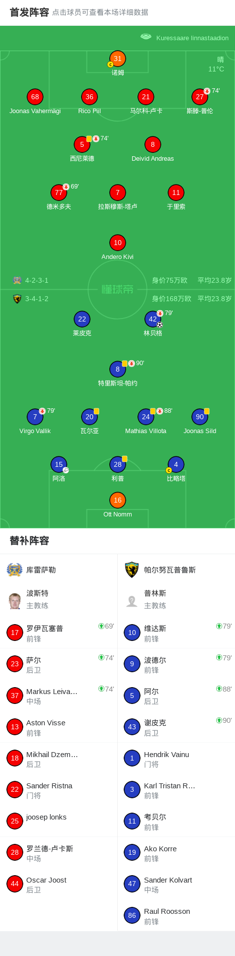 帕尔努瓦普鲁斯1-0库雷萨勒,林贝格制胜 足球资讯 发布时间: 2026年4月22日 阅读时间: 少于1 分钟 FacebookXPinterestWhatsApp 帕尔努瓦普鲁斯1-0库雷萨勒,林贝格制胜 北京时间4月21日爱沙尼亚足球甲级联赛 联赛 第8轮,库雷萨勒主场对阵帕尔努瓦普鲁斯。帕尔努瓦普鲁斯林贝格破门。最终比分库雷萨勒 0–1 帕尔努瓦普鲁斯。 点击查看本场比赛详细数据>> 点击查看爱沙甲完整积分榜>> 精彩瞬间 第57分钟,帕尔努瓦普鲁斯球员阿洛助攻林贝格打入一球。 球队阵容 技术统计 FacebookXPinterestWhatsApp 1823100https://1823100.com 红单推荐 015 西甲 巴萨vs塞尔塔 红单推荐 2026年4月22日 012 英超 伯恩茅斯vs利兹联 红单推荐 2026年4月22日 007 意杯 国际米兰vs科莫 红单推荐 2026年4月21日 005 西甲 毕尔巴鄂竞技vs奥萨苏纳 红单推荐 2026年4月21日 001 意甲 莱切vs佛罗伦萨 红单推荐 2026年4月20日 热门资讯 004 欧冠 巴萨vs马竞 红单推荐 2026年4月8日 三人20+!火箭21分逆转太阳7连胜 KD24分阿门22+11+8 篮球资讯 2026年4月8日 005 英超 曼联vs利兹联 红单推荐 2026年4月13日 007 意杯 国际米兰vs科莫 红单推荐 2026年4月21日 马卡:巴萨进入“换代期”,五位球员或将离队 足球资讯 2026年4月21日