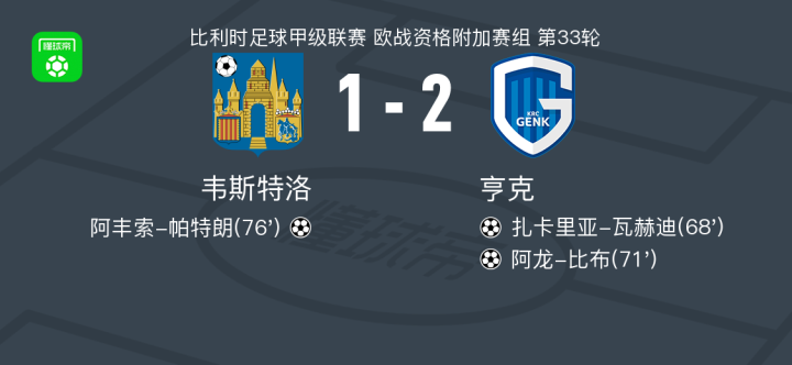 北京时间4月19日比利时足球甲级联赛 欧战资格附加赛组 第33轮,韦斯特洛主场对阵亨克。韦斯特洛阿丰索-帕特朗破门。亨克扎卡里亚-瓦赫迪破门,阿龙-比布破门。最终比分韦斯特洛 12 亨克。