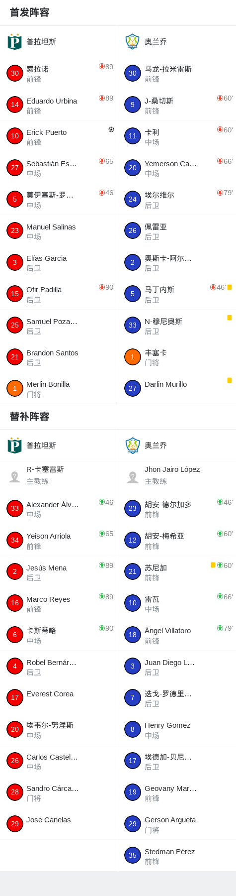 第72分钟,普拉坦斯球员Erick Puerto打入一球。