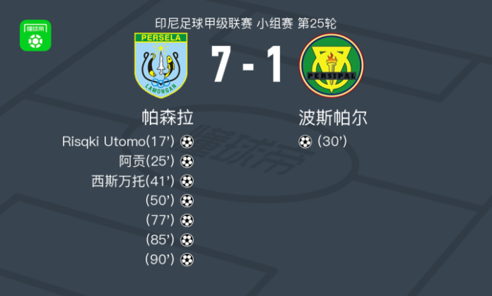 北京时间4月18日印尼足球甲级联赛 小组赛 第25轮,帕森拉主场对阵波斯帕尔。帕森拉Risqki Utomo破门,阿贡破门,西斯万托破门。最终比分帕森拉 7–1 波斯帕尔。