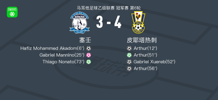 北京时间4月12日马耳他足球乙级联赛 冠军赛 第6轮,塞壬主场对阵皮耶塔热刺。塞壬Hafiz Mohammed Akadom破门,Thiago Nonato破门。皮耶塔热刺Arthur帽子戏法,Gabriel Xuereb破门,Gabriel Mannino自摆乌龙。最终比分塞壬 3–4 皮耶塔热刺。