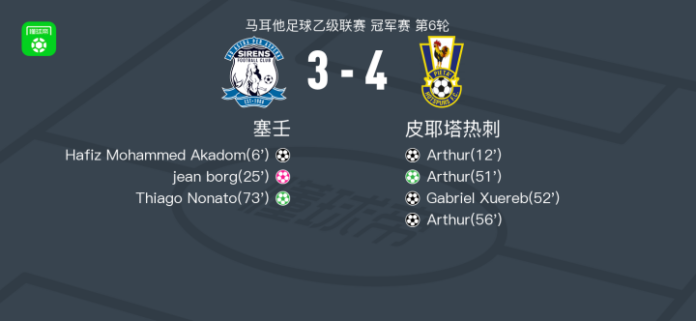 北京时间4月12日马耳他足球乙级联赛 冠军赛 第6轮,塞壬主场对阵皮耶塔热刺。塞壬Hafiz Mohammed Akadom破门,Thiago Nonato破门。皮耶塔热刺Arthur帽子戏法,Gabriel Xuereb破门,jean borg自摆乌龙。最终比分塞壬 3–4 皮耶塔热刺。