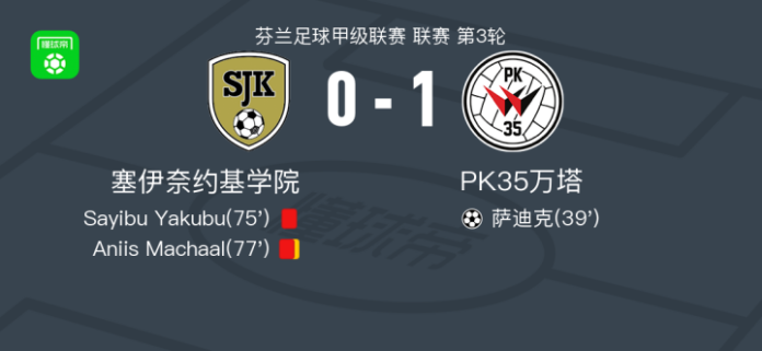北京时间4月19日芬兰足球甲级联赛 联赛 第3轮,塞伊奈约基学院主场对阵PK35万塔。PK35万塔萨迪克破门。最终比分塞伊奈约基学院 01 PK35万塔。