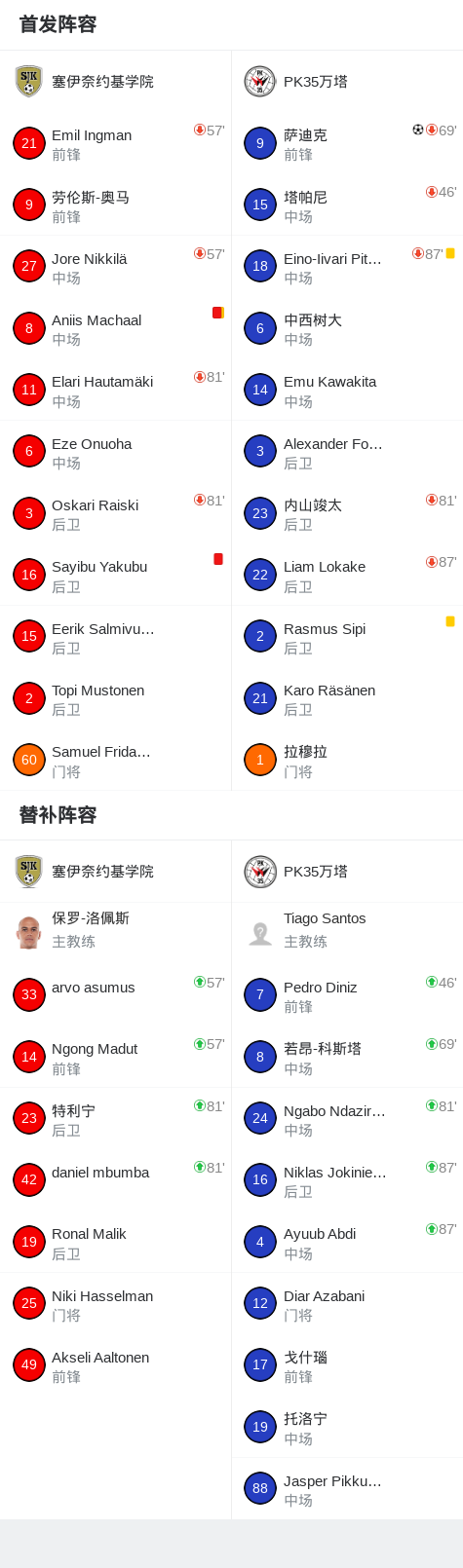 第75分钟,塞伊奈约基学院球队Sayibu Yakubu吃到红牌。