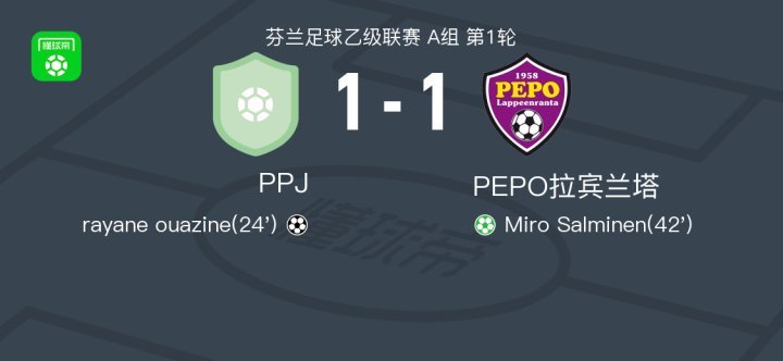 北京时间4月18日芬兰足球乙级联赛 A组 第1轮,PPJ主场对阵PEPO拉宾兰塔。PPJrayane ouazine破门。PEPO拉宾兰塔Miro Salminen破门。最终比分PPJ 1–1 PEPO拉宾兰塔。