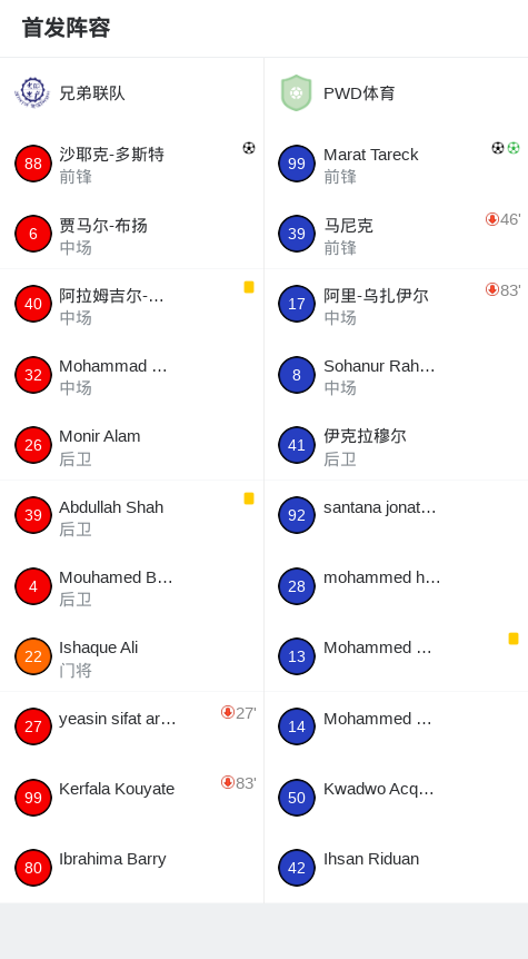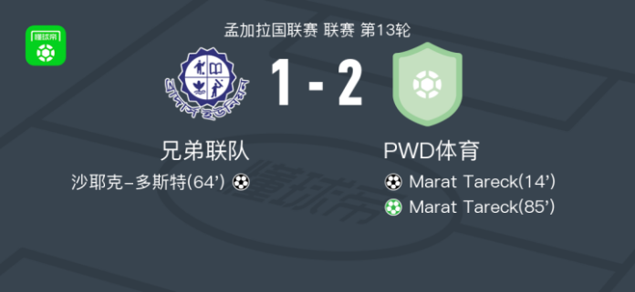 北京时间4月18日孟加拉国联赛 联赛 第13轮,兄弟联队主场对阵PWD体育。兄弟联队沙耶克-多斯特破门。PWD体育Marat Tareck梅开二度。最终比分兄弟联队 12 PWD体育。
