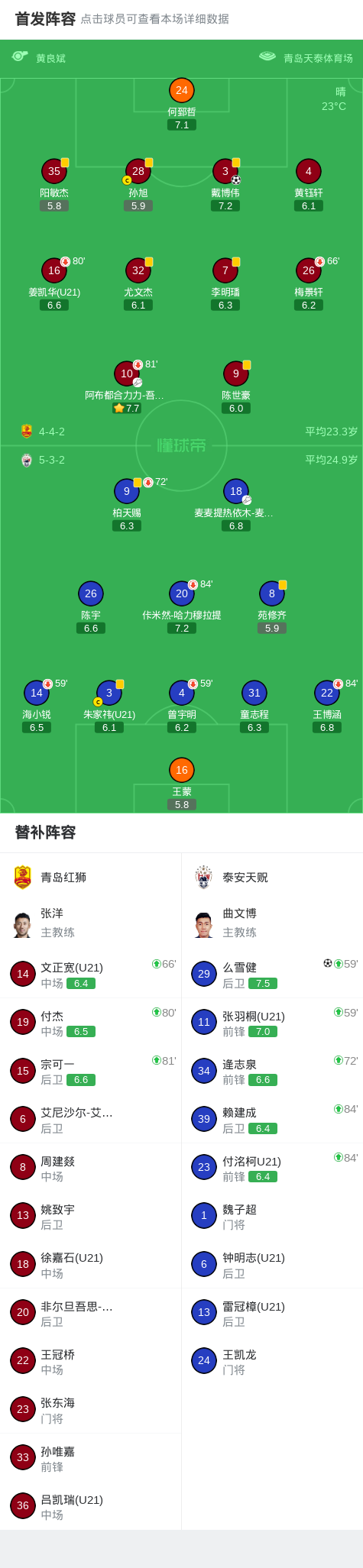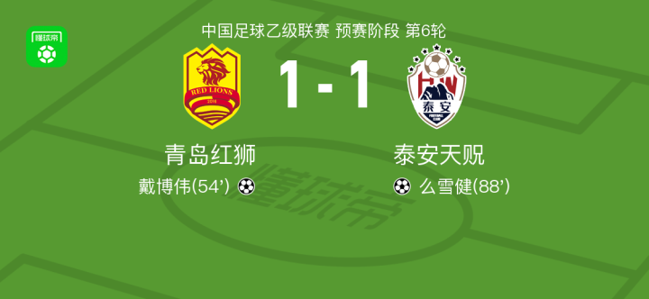北京时间4月30日中国足球乙级联赛 预赛阶段 第6轮,青岛红狮主场对阵泰安天贶。青岛红狮戴博伟破门。泰安天贶么雪健破门。最终比分青岛红狮 11 泰安天贶。