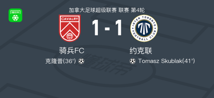 北京时间4月26日加拿大足球超级联赛 联赛 第4轮,骑兵FC主场对阵约克联。骑兵FC克隆普破门。约克联Tomasz Skublak破门。最终比分骑兵FC 11 约克联。
