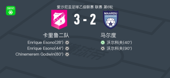 北京时间4月18日爱沙尼亚足球乙级联赛 联赛 第6轮,卡里鲁二队主场对阵马尔度。卡里鲁二队Enrique Esono梅开二度,Chinemerem Godwin破门。马尔度沃尔科夫梅开二度。最终比分卡尔路B队 3–2 马尔度伊斯特夫。