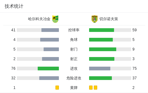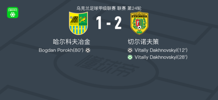 北京时间4月17日乌克兰足球甲级联赛 联赛 第24轮,哈尔科夫冶金主场对阵切尔诺夫策。哈尔科夫冶金Bogdan Porokh破门。切尔诺夫策Vitaliy Dakhnovskyi梅开二度。最终比分哈尔科夫冶金 1–2 切尔诺夫策。