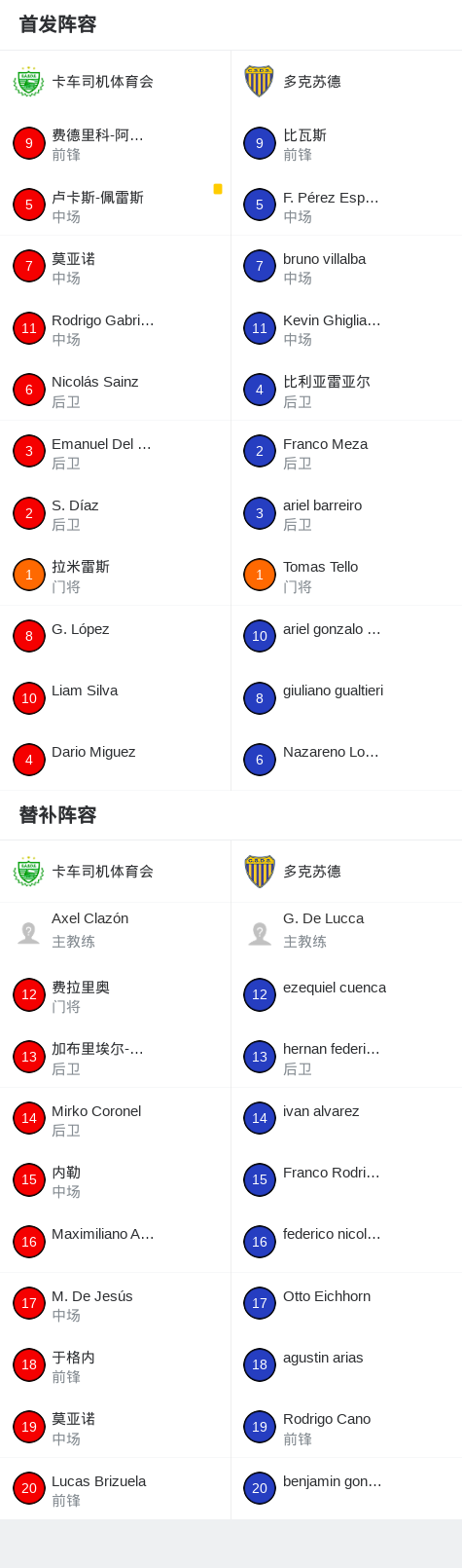 卡车司机体育会0-0多克苏德,势均力敌 足球资讯 发布时间: 2026年4月13日 阅读时间: 少于1 分钟 FacebookXPinterestWhatsApp 卡车司机体育会0-0多克苏德,势均力敌 北京时间4月13日阿根廷足球乙级大都会区联赛 春季联赛 第10轮,卡车司机体育会主场对阵多克苏德。最终比分卡车司机体育会 0–0 多克苏德。 点击查看本场比赛详细数据>> 球队阵容 技术统计 FacebookXPinterestWhatsApp 1823100https://1823100.com 红单推荐 007 意杯 国际米兰vs科莫 红单推荐 2026年4月21日 005 西甲 毕尔巴鄂竞技vs奥萨苏纳 红单推荐 2026年4月21日 001 意甲 莱切vs佛罗伦萨 红单推荐 2026年4月20日 003 英超 水晶宫vs西汉姆联 红单推荐 2026年4月20日 019 英超 曼城vs阿森纳 红单推荐 2026年4月19日 热门资讯 004 欧冠 巴萨vs马竞 红单推荐 2026年4月8日 三人20+!火箭21分逆转太阳7连胜 KD24分阿门22+11+8 篮球资讯 2026年4月8日 007 意杯 国际米兰vs科莫 红单推荐 2026年4月21日 马卡:巴萨进入“换代期”,五位球员或将离队 足球资讯 2026年4月21日 记者:尤文希望2500万至3000万欧签回穆阿尼 足球资讯 2026年4月22日
