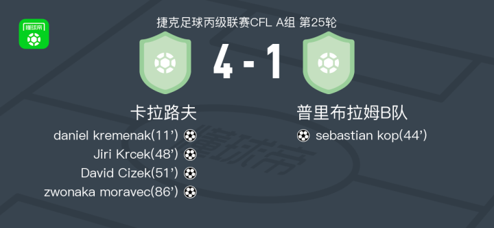 北京时间4月25日捷克足球丙级联赛CFL A组 第25轮,卡拉路夫主场对阵普里布拉姆B队。卡拉路夫daniel kremenak破门,Jiri Krcek破门,David Cizek破门,zwonaka moravec破门。普里布拉姆B队sebastian kop破门。最终比分卡拉路夫 4–1 普里布拉姆B队。
