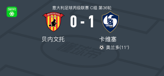 卡维塞1-0贝内文托,奥兰多一剑封喉 足球资讯 发布时间: 2026年4月14日 阅读时间: 少于1 分钟 FacebookXPinterestWhatsApp 卡维塞1-0贝内文托,奥兰多一剑封喉 北京时间4月14日意大利足球丙级联赛 C组 第36轮,贝内文托主场对阵卡维塞。卡维塞奥兰多破门。最终比分贝内文托 0–1 卡维塞。 点击查看本场比赛详细数据>> 点击查看意丙完整积分榜>> 精彩瞬间 第11分钟,卡维塞球员奥兰多打入一球。 球队阵容 技术统计 FacebookXPinterestWhatsApp 1823100https://1823100.com 红单推荐 015 西甲 巴萨vs塞尔塔 红单推荐 2026年4月22日 012 英超 伯恩茅斯vs利兹联 红单推荐 2026年4月22日 007 意杯 国际米兰vs科莫 红单推荐 2026年4月21日 005 西甲 毕尔巴鄂竞技vs奥萨苏纳 红单推荐 2026年4月21日 001 意甲 莱切vs佛罗伦萨 红单推荐 2026年4月20日 热门资讯 萨拉戈萨U19 0-0乌德山U19,双方握手言和 足球资讯 2026年4月12日 克莱普尔1-0巴拉卡斯体育,Aaron Caraballo一锤定音 足球资讯 2026年4月13日 007 英冠 伊普斯维奇vs米德尔斯堡 红单推荐 2026年4月19日 019 英超 曼城vs阿森纳 红单推荐 2026年4月19日 萨拉赫安菲尔德英超进108球,联赛历史单座球场进球仅次于亨利 足球资讯 2026年4月12日