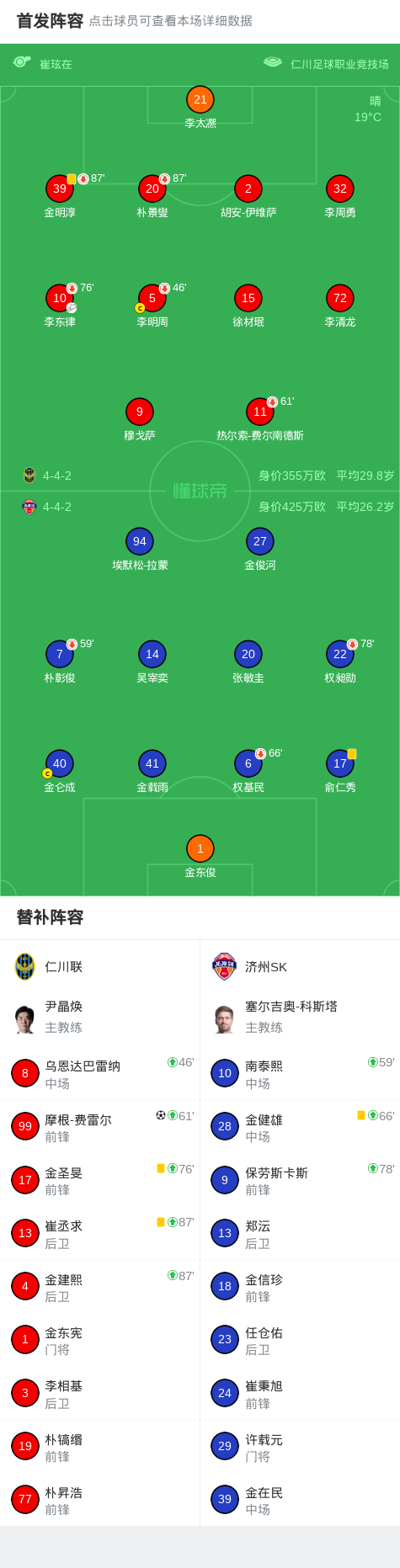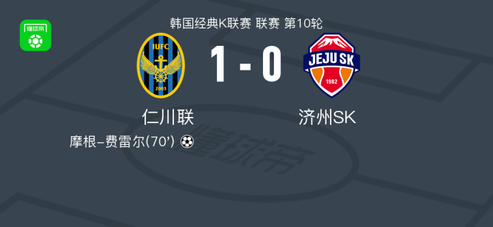 仁川联1-0济州SK,摩根-费雷尔一锤定音 足球资讯 发布时间: 2026年4月25日 阅读时间: 少于1 分钟 FacebookXPinterestWhatsApp 仁川联1-0济州SK,摩根-费雷尔一锤定音 北京时间4月25日韩国经典K联赛 联赛 第10轮,仁川联主场对阵济州SK。仁川联摩根-费雷尔破门。最终比分仁川联 1–0 济州SK。 点击查看本场比赛详细数据>> 点击查看K联赛完整积分榜>> 精彩瞬间 第70分钟,仁川联球员李东律助攻摩根-费雷尔打入一球。 球队阵容 技术统计 FacebookXPinterestWhatsApp 1823100https://1823100.com 红单推荐 021 西甲 奥萨苏纳vs塞维利亚 红单推荐 2026年4月26日 013 英足总杯 切尔西(中)vs利兹联 红单推荐 2026年4月26日 023 英超 阿森纳vs纽卡斯尔 红单推荐 2026年4月25日 016 英超 狼队vs热刺 红单推荐 2026年4月25日 013 英超 桑德兰vs诺丁汉 红单推荐 2026年4月24日 热门资讯 约基奇第198次三双!掘金大胜灰熊豪取10连胜 穆雷26+7+5 篮球资讯 2026年4月9日 三人20+!火箭21分逆转太阳7连胜 KD24分阿门22+11+8 篮球资讯 2026年4月8日 002 欧协联 巴列卡诺vs雅典AEK 红单推荐 2026年4月9日 003 欧冠 利物浦vs巴黎圣日耳曼 红单推荐 2026年4月14日 004 欧冠 巴萨vs马竞 红单推荐 2026年4月8日