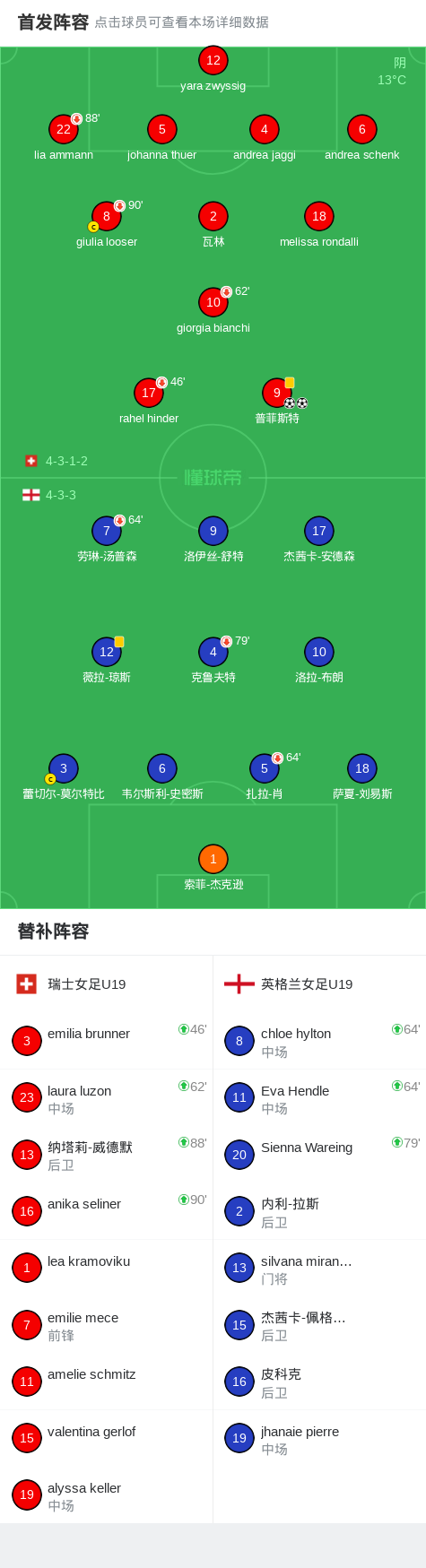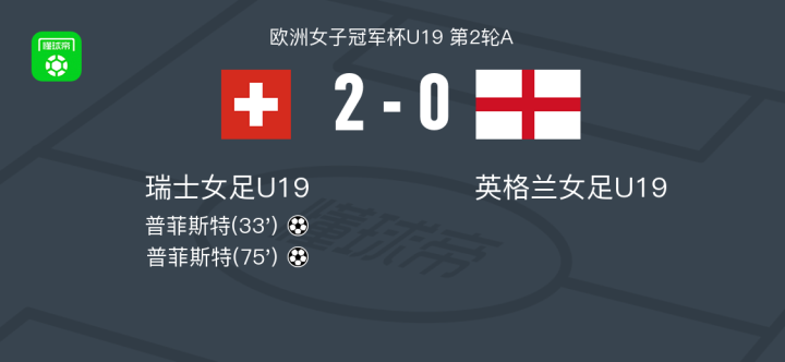 瑞士女足U19 2-0英格兰女足U19,普菲斯特包办2球 足球资讯 发布时间: 2026年4月15日 阅读时间: 少于1 分钟 FacebookXPinterestWhatsApp 瑞士女足U19 2-0英格兰女足U19,普菲斯特包办2球 北京时间4月15日欧洲女子冠军杯U19 第2轮A,瑞士女足U19对阵英格兰女足U19。瑞士女足U19普菲斯特梅开二度。最终比分瑞士女足U19 2–0 英格兰女足U19。 点击查看本场比赛详细数据>> 精彩瞬间 第33分钟,瑞士女足U19球员普菲斯特打入一球。 第75分钟,瑞士女足U19球员普菲斯特打入一球。 球队阵容 技术统计 FacebookXPinterestWhatsApp 1823100https://1823100.com 红单推荐 014 西甲 贝蒂斯vs皇马 红单推荐 2026年4月24日 005 西甲 巴列卡诺vs西班牙人 红单推荐 2026年4月23日 003 西甲 莱万特vs塞维利亚 红单推荐 2026年4月23日 015 西甲 巴萨vs塞尔塔 红单推荐 2026年4月22日 012 英超 伯恩茅斯vs利兹联 红单推荐 2026年4月22日 热门资讯 约基奇第198次三双!掘金大胜灰熊豪取10连胜 穆雷26+7+5 篮球资讯 2026年4月9日 三人20+!火箭21分逆转太阳7连胜 KD24分阿门22+11+8 篮球资讯 2026年4月8日 002 欧协联 巴列卡诺vs雅典AEK 红单推荐 2026年4月9日 萨拉戈萨U19 0-0乌德山U19,双方握手言和 足球资讯 2026年4月12日 004 欧冠 巴萨vs马竞 红单推荐 2026年4月8日