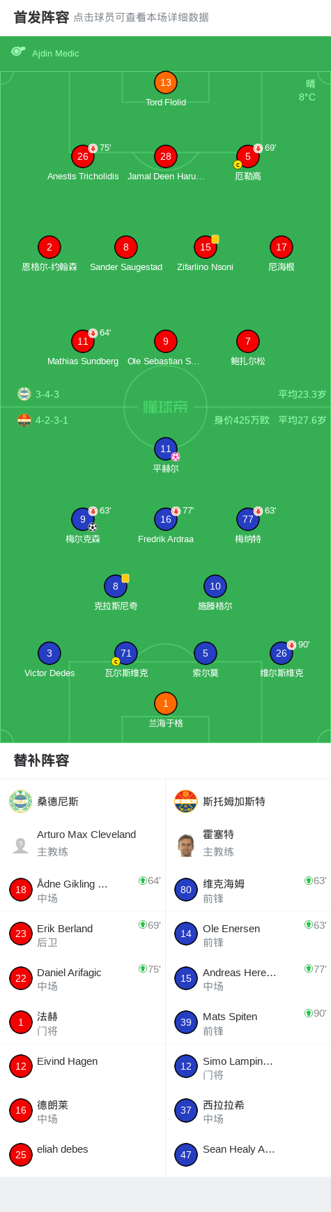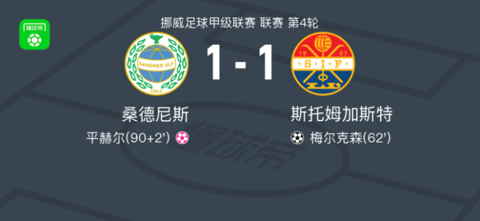 桑德尼斯1-1斯托姆加斯特,梅尔克森建功 足球资讯 发布时间: 2026年4月27日 阅读时间: 少于1 分钟 FacebookXPinterestWhatsApp 桑德尼斯1-1斯托姆加斯特,梅尔克森建功 北京时间4月26日挪威足球甲级联赛 联赛 第4轮,桑德尼斯主场对阵斯托姆加斯特。斯托姆加斯特梅尔克森破门,平赫尔自摆乌龙。最终比分桑德尼斯 1–1 斯托姆加斯特。 点击查看本场比赛详细数据>> 点击查看挪甲完整积分榜>> 精彩瞬间 第62分钟,斯托姆加斯特球员梅尔克森打入一球。 下半场补时第2分钟,斯托姆加斯特球员平赫尔自摆乌龙。 球队阵容 技术统计 FacebookXPinterestWhatsApp 1823100https://1823100.com 红单推荐 021 西甲 奥萨苏纳vs塞维利亚 红单推荐 2026年4月26日 013 英足总杯 切尔西(中)vs利兹联 红单推荐 2026年4月26日 023 英超 阿森纳vs纽卡斯尔 红单推荐 2026年4月25日 016 英超 狼队vs热刺 红单推荐 2026年4月25日 013 英超 桑德兰vs诺丁汉 红单推荐 2026年4月24日 热门资讯 官方:贺希宁当选本赛季CBA常规赛MVP 篮球资讯 2026年4月26日 阿贾克斯女足0-0费耶诺德女足,秋色平分 足球资讯 2026年4月26日 马竞官方:巴里奥斯左大腿肌肉受伤,回归时间取决于恢复情况 足球资讯 2026年4月26日 阿拉德纺织厂0-0康斯坦察灯塔,平分秋色 足球资讯 2026年4月26日 官方:上海队主帅卢伟当选本赛季CBA常规赛最佳教练员 篮球资讯 2026年4月26日