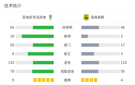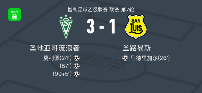 北京时间4月13日智利足球乙级联赛 联赛 第7轮,圣地亚哥流浪者主场对阵圣路易斯。圣地亚哥流浪者费利佩破门。圣路易斯马德里加尔破门。最终比分圣地亚哥流浪者 3–1 圣路易斯。