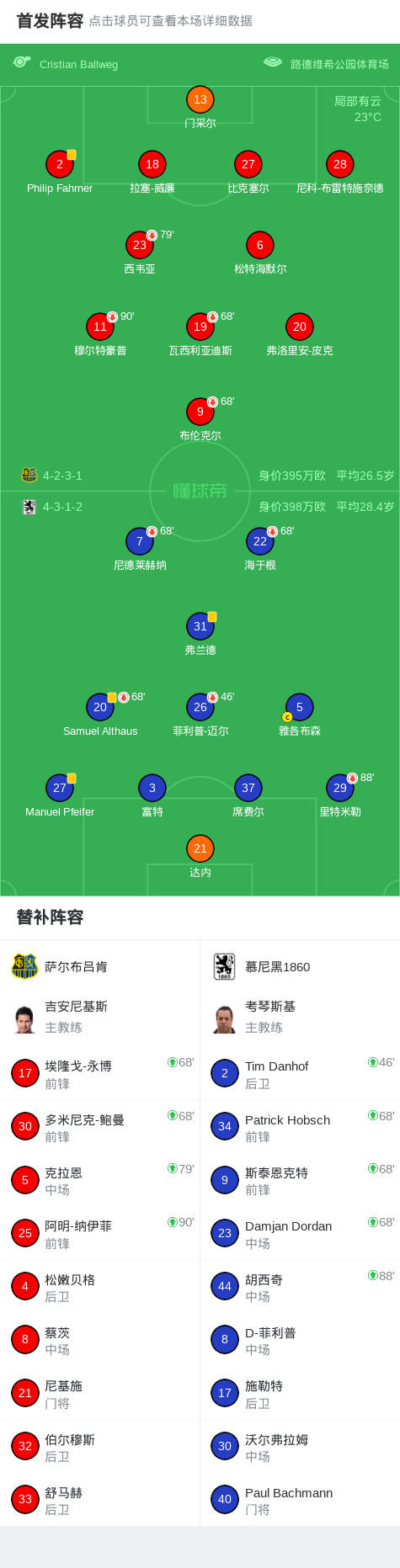 萨尔布吕肯 0-0慕尼黑1860,双方握手言和 足球资讯 发布时间: 2026年4月18日 阅读时间: 少于1 分钟 FacebookXPinterestWhatsApp 萨尔布吕肯 0-0慕尼黑1860,双方握手言和 北京时间4月18日德国丙级联赛 联赛 第34轮,萨尔布吕肯 主场对阵慕尼黑1860。最终比分萨尔布吕肯 0–0 慕尼黑1860。 点击查看本场比赛详细数据>> 点击查看德丙完整积分榜>> 球队阵容 技术统计 FacebookXPinterestWhatsApp 1823100https://1823100.com 红单推荐 023 英超 阿森纳vs纽卡斯尔 红单推荐 2026年4月25日 016 英超 狼队vs热刺 红单推荐 2026年4月25日 013 英超 桑德兰vs诺丁汉 红单推荐 2026年4月24日 014 西甲 贝蒂斯vs皇马 红单推荐 2026年4月24日 005 西甲 巴列卡诺vs西班牙人 红单推荐 2026年4月23日 热门资讯 003 西甲 莱万特vs塞维利亚 红单推荐 2026年4月23日 023 英超 阿森纳vs纽卡斯尔 红单推荐 2026年4月25日 三人20+!火箭21分逆转太阳7连胜 KD24分阿门22+11+8 篮球资讯 2026年4月8日 001 意甲 莱切vs佛罗伦萨 红单推荐 2026年4月20日 约基奇第198次三双!掘金大胜灰熊豪取10连胜 穆雷26+7+5 篮球资讯 2026年4月9日