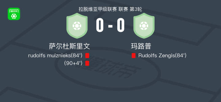 萨尔杜斯里文0-0玛路普,双方破门乏术 足球资讯 发布时间: 2026年4月13日 阅读时间: 少于1 分钟 FacebookXPinterestWhatsApp 萨尔杜斯里文0-0玛路普,双方破门乏术 北京时间4月12日拉脱维亚甲级联赛 联赛 第3轮,萨尔杜斯里文主场对阵玛路普。最终比分萨尔杜斯里文 0–0 玛路普。 点击查看本场比赛详细数据>> 精彩瞬间 第84分钟,玛路普球队Rudolfs Zengis吃到红牌。 第84分钟,萨尔杜斯里文球队rudolfs muiznieks吃到红牌。 下半场补时第4分钟,萨尔杜斯里文球队吃到红牌。 技术统计 FacebookXPinterestWhatsApp 1823100https://1823100.com 红单推荐 007 意杯 国际米兰vs科莫 红单推荐 2026年4月21日 005 西甲 毕尔巴鄂竞技vs奥萨苏纳 红单推荐 2026年4月21日 001 意甲 莱切vs佛罗伦萨 红单推荐 2026年4月20日 003 英超 水晶宫vs西汉姆联 红单推荐 2026年4月20日 019 英超 曼城vs阿森纳 红单推荐 2026年4月19日 热门资讯 023 英超 利物浦vs富勒姆 红单推荐 2026年4月11日 007 英冠 伊普斯维奇vs米德尔斯堡 红单推荐 2026年4月19日 005 英超 曼联vs利兹联 红单推荐 2026年4月13日 019 英超 曼城vs阿森纳 红单推荐 2026年4月19日 007 意杯 国际米兰vs科莫 红单推荐 2026年4月21日