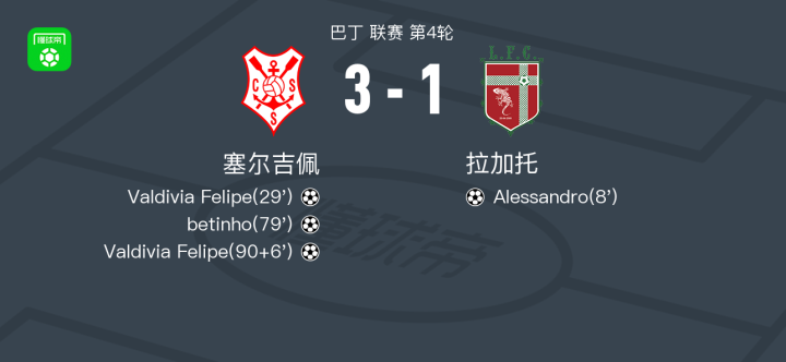 北京时间4月26日巴丁 联赛 第4轮,塞尔吉佩主场对阵拉加托。塞尔吉佩Valdivia Felipe梅开二度,betinho破门。拉加托Alessandro破门。最终比分塞尔吉佩 3–1 拉加托。