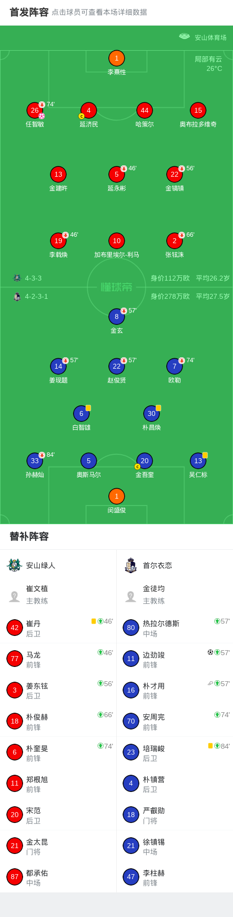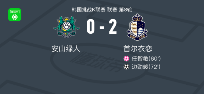 首尔衣恋2-0安山绿人,边劲竣建功 足球资讯 发布时间: 2026年4月19日 阅读时间: 少于1 分钟 FacebookXPinterestWhatsApp 首尔衣恋2-0安山绿人,边劲竣建功 北京时间4月19日韩国挑战K联赛 联赛 第8轮,安山绿人主场对阵首尔衣恋。安山绿人任智敏自摆乌龙。首尔衣恋边劲竣破门。最终比分安山绿人 0–2 首尔衣恋。 点击查看本场比赛详细数据>> 点击查看韩K2联完整积分榜>> 精彩瞬间 第60分钟,安山绿人球员任智敏自摆乌龙。 第72分钟,首尔衣恋球员朴才用助攻边劲竣打入一球。 球队阵容 技术统计 FacebookXPinterestWhatsApp 1823100https://1823100.com 红单推荐 005 西甲 巴列卡诺vs西班牙人 红单推荐 2026年4月23日 003 西甲 莱万特vs塞维利亚 红单推荐 2026年4月23日 015 西甲 巴萨vs塞尔塔 红单推荐 2026年4月22日 012 英超 伯恩茅斯vs利兹联 红单推荐 2026年4月22日 007 意杯 国际米兰vs科莫 红单推荐 2026年4月21日 热门资讯 萨拉戈萨U19 0-0乌德山U19,双方握手言和 足球资讯 2026年4月12日 萨拉赫安菲尔德英超进108球,联赛历史单座球场进球仅次于亨利 足球资讯 2026年4月12日 萨拉赫英超打入157粒非点球进球,追平阿圭罗列历史第五 足球资讯 2026年4月12日 郑大世:森保一执教风格很有人情味;日本队还得日本人执教 足球资讯 2026年4月23日 萨拉赫英超参与250粒非点球进球,成历史第五人 足球资讯 2026年4月12日