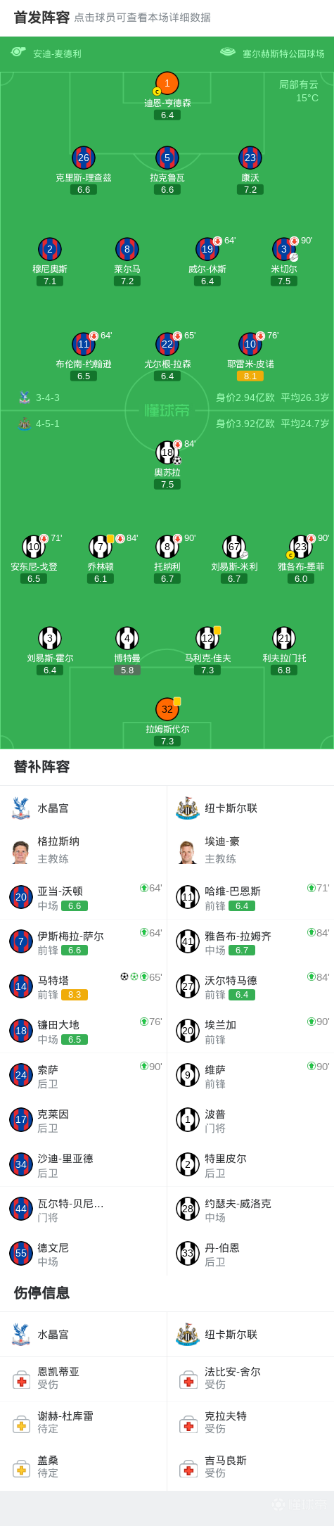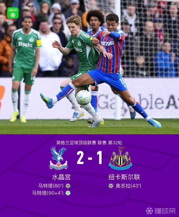 北京时间4月12日英格兰足球顶级联赛 联赛 第32轮,水晶宫主场对阵纽卡斯尔联。水晶宫马特塔梅开二度。纽卡斯尔联奥苏拉破门。最终比分水晶宫 2–1 纽卡斯尔联。
