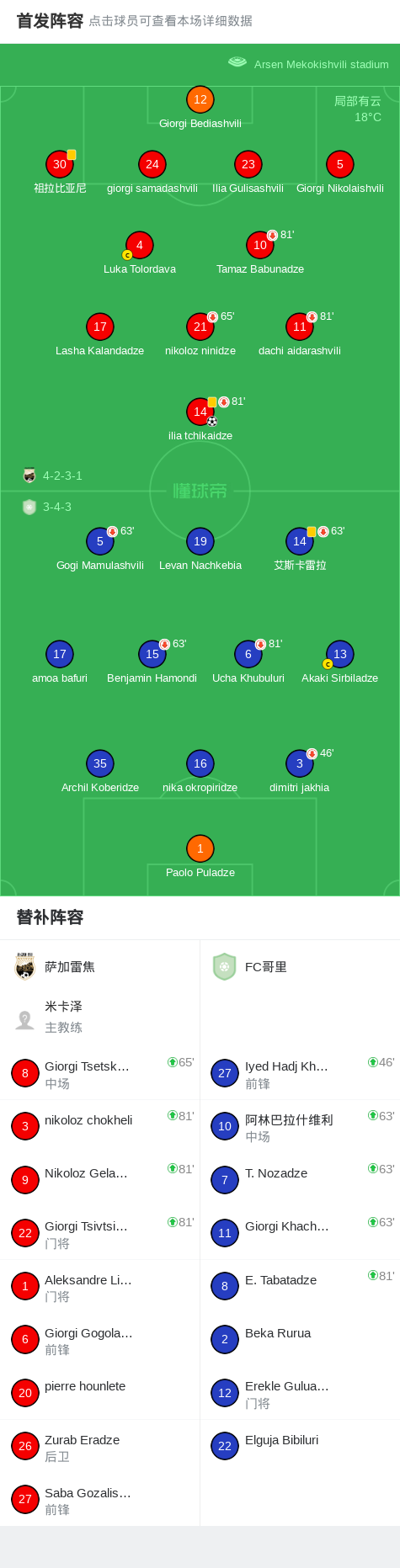 萨加雷焦1-0FC哥里,ilia tchikaidze一剑封喉 足球资讯 发布时间: 2026年4月22日 阅读时间: 少于1 分钟 FacebookXPinterestWhatsApp 萨加雷焦1-0FC哥里,ilia tchikaidze一剑封喉 北京时间4月22日格鲁吉亚乙级联赛 联赛 第8轮,萨加雷焦主场对阵FC哥里。萨加雷焦ilia tchikaidze破门。最终比分萨加雷焦 1–0 FC哥里。 点击查看本场比赛详细数据>> 精彩瞬间 上半场补时第1分钟,萨加雷焦球员ilia tchikaidze打入一球。 球队阵容 技术统计 FacebookXPinterestWhatsApp 1823100https://1823100.com 红单推荐 005 西甲 巴列卡诺vs西班牙人 红单推荐 2026年4月23日 003 西甲 莱万特vs塞维利亚 红单推荐 2026年4月23日 015 西甲 巴萨vs塞尔塔 红单推荐 2026年4月22日 012 英超 伯恩茅斯vs利兹联 红单推荐 2026年4月22日 007 意杯 国际米兰vs科莫 红单推荐 2026年4月21日 热门资讯 萨拉戈萨U19 0-0乌德山U19,双方握手言和 足球资讯 2026年4月12日 萨拉赫安菲尔德英超进108球,联赛历史单座球场进球仅次于亨利 足球资讯 2026年4月12日 萨拉赫英超打入157粒非点球进球,追平阿圭罗列历史第五 足球资讯 2026年4月12日 郑大世:森保一执教风格很有人情味;日本队还得日本人执教 足球资讯 2026年4月23日 萨拉赫英超参与250粒非点球进球,成历史第五人 足球资讯 2026年4月12日