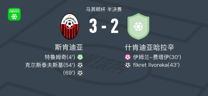 北京时间4月22日马其顿杯 半决赛,斯肯迪亚对阵什肯迪亚哈拉辛。斯肯迪亚特鲁姆奇破门,克尔斯泰夫斯基破门,伊姆兰-费塔伊自摆乌龙。什肯迪亚哈拉辛fikret livoreka破门。最终比分斯肯迪亚 3–2 什肯迪亚哈拉辛。