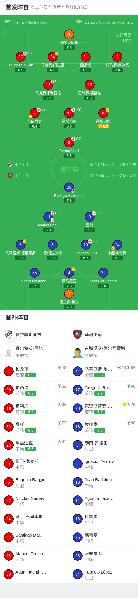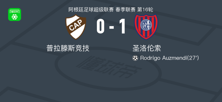 北京时间4月25日阿根廷足球超级联赛 春季联赛 第16轮,普拉滕斯竞技主场对阵圣洛伦索。圣洛伦索Rodrigo Auzmendi破门。最终比分普拉滕斯竞技 0–1 圣洛伦索。