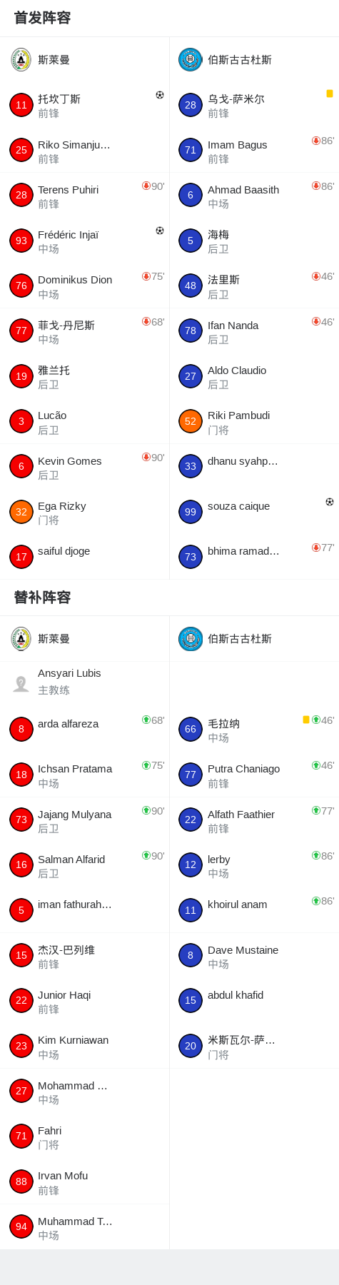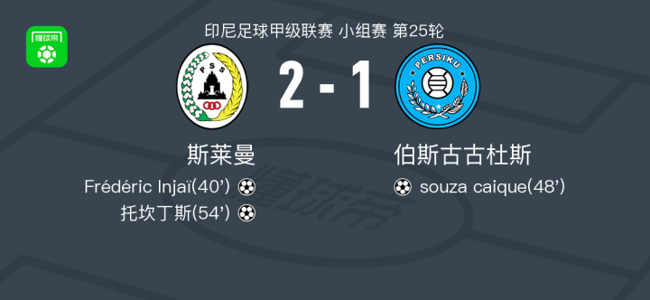 北京时间4月20日印尼足球甲级联赛 小组赛 第25轮,斯莱曼主场对阵伯斯古古杜斯。斯莱曼Frédéric Injaï破门,托坎丁斯破门。伯斯古古杜斯souza caique破门。最终比分斯莱曼 2–1 伯斯古古杜斯。