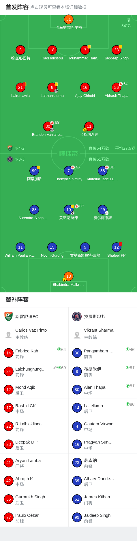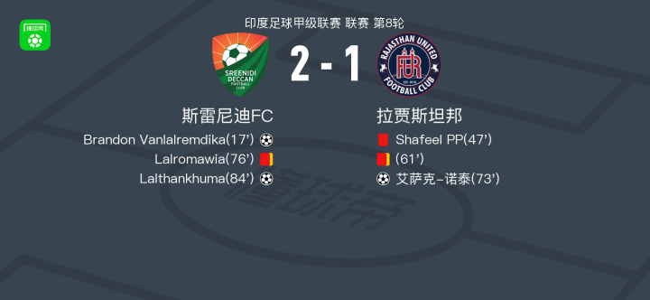 北京时间4月12日印度足球甲级联赛 联赛 第8轮,斯雷尼迪FC主场对阵拉贾斯坦邦。斯雷尼迪FCBrandon Vanlalremdika破门,Lalthankhuma破门。拉贾斯坦邦艾萨克-诺泰破门。最终比分斯雷尼迪FC 2–1 拉贾斯坦邦。