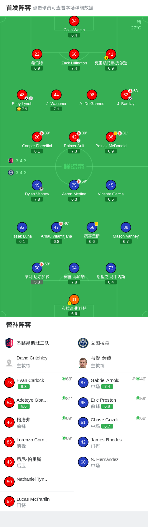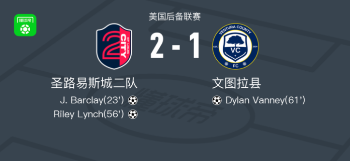 北京时间4月27日美国后备联赛,圣路易斯城二队对阵文图拉县。圣路易斯城二队J. Barclay破门,Riley Lynch破门。文图拉县Dylan Vanney破门。最终比分圣路易斯城二队 21 文图拉县。