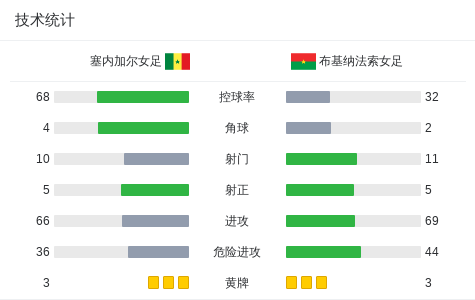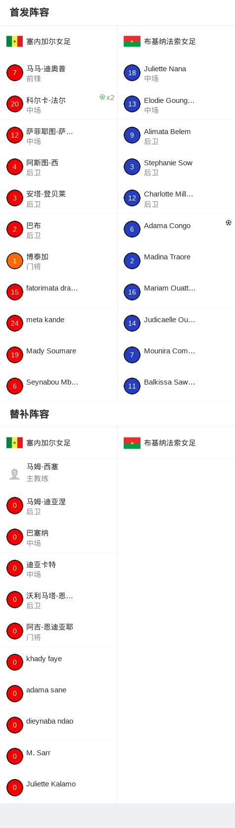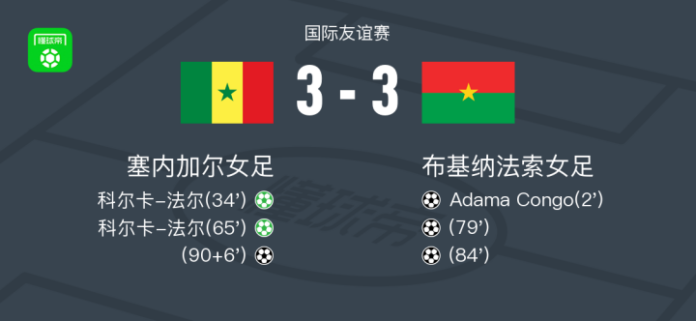 北京时间4月17日国际友谊赛,塞内加尔女足对阵布基纳法索女足。塞内加尔女足科尔卡-法尔梅开二度。布基纳法索女足Adama Congo破门。最终比分塞内加尔女足 3–3 布基纳法索女足。